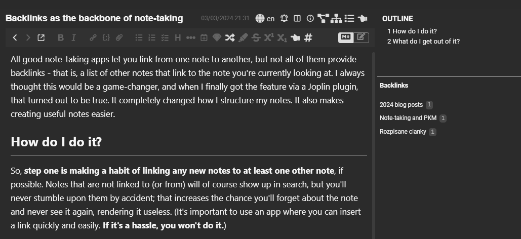 All good note-taking apps let you link from one note to another, but not all of them provide backlinks - that is, a list of other notes that link to the note you're currently looking at. I always thought this would be a game-changer, and when I finally got the feature via a Joplin plugin, that turned out to be true. It completely changed how I structure my notes. It also makes creating useful notes easier.