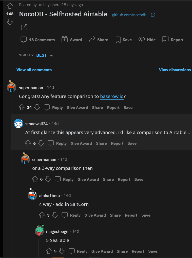 So when I say I want an alternative, I basically mean I want a spreadsheet with relationships between tables, with a nice UI and an HTTP API. As is usually the case when I'm looking for a self-hosted alternative to something, googling yields nothing of interest (in this case, only commercial alternatives for startups, for specific use-cases, and other things completely irrelevant to me). I only find something interesting when I go to places where people talk about self-hosting and read randomly until I stumble upon what I need by accident. 😀 In this case, this thread on r/selfhosted.