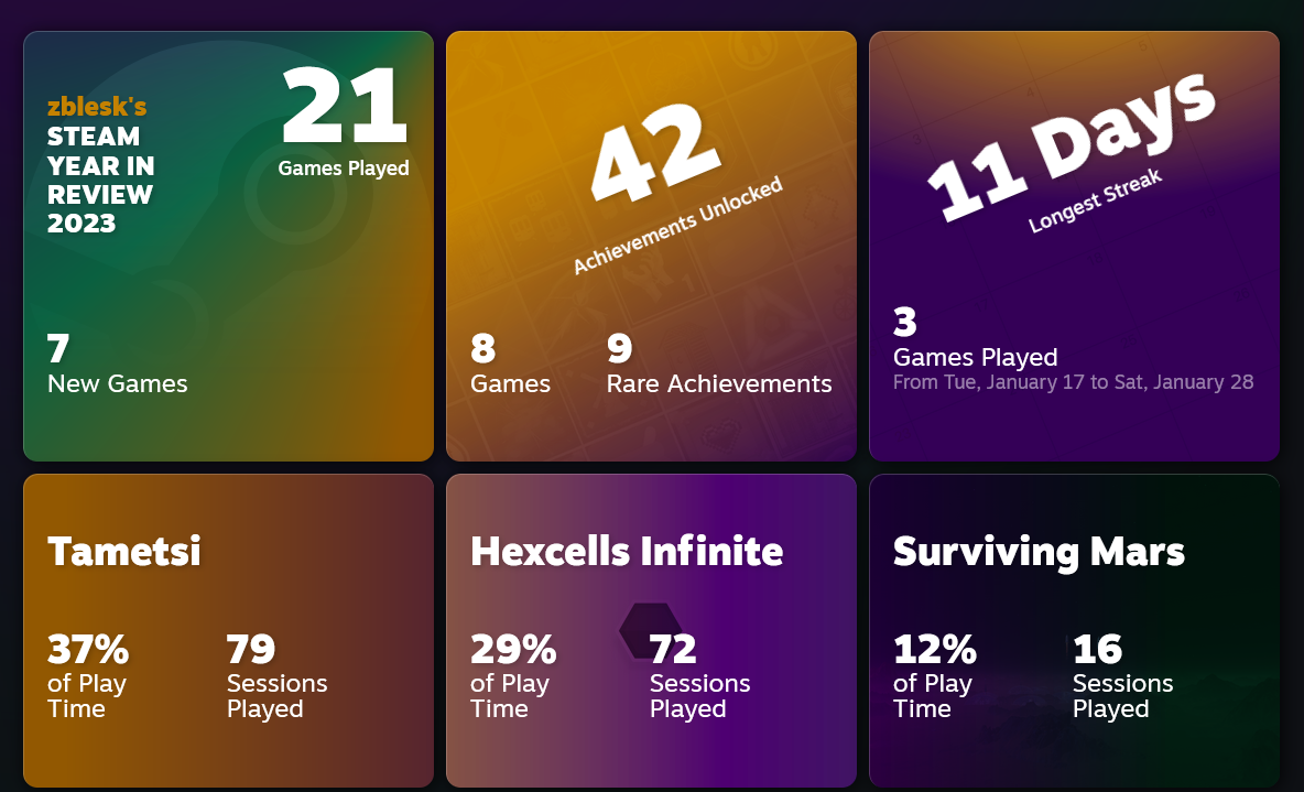 That's a lot of games played. In fact, about twice as many as the year prior. However, none of my top 3 games - Tametsi, Hexcells Infinite and Surviving Mars - are new to me. They're familiar games that I return to when I want to unwind for a bit, maybe while listening to a podcast or a video essay. And together they make up a whopping 78% of my total playtime, leaving only 22% for all the other 18 games combined.