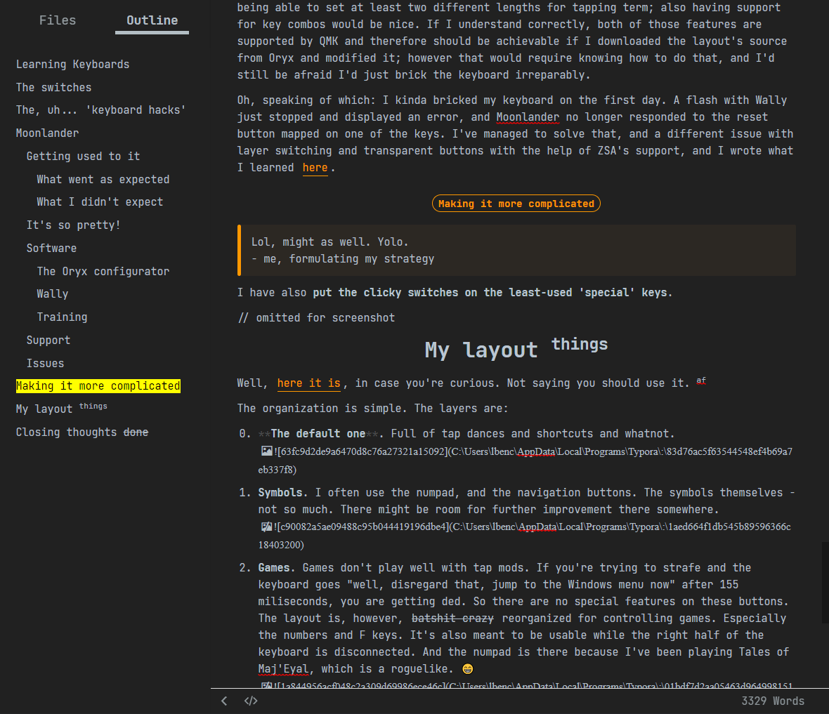 You might suggest that details like these don't really matter and that it's not reason enough to pay for Typora. But I like my oft-used tools to offer the best experience possible. And it's about friction. Visually scanning the outline of the doc I'm currently working on is something I do often, and when the MD syntax in it is displayed but isn't rendered, that just makes me slow down to parse it - basically defeating the point of adding any formatting to a heading.